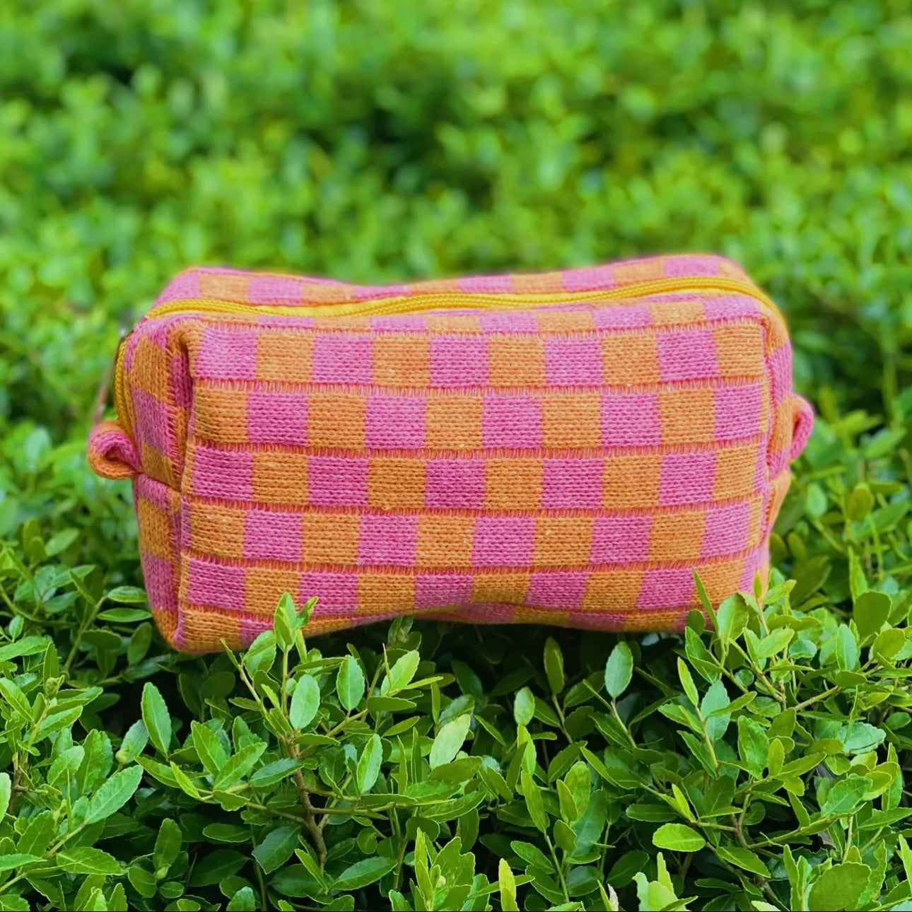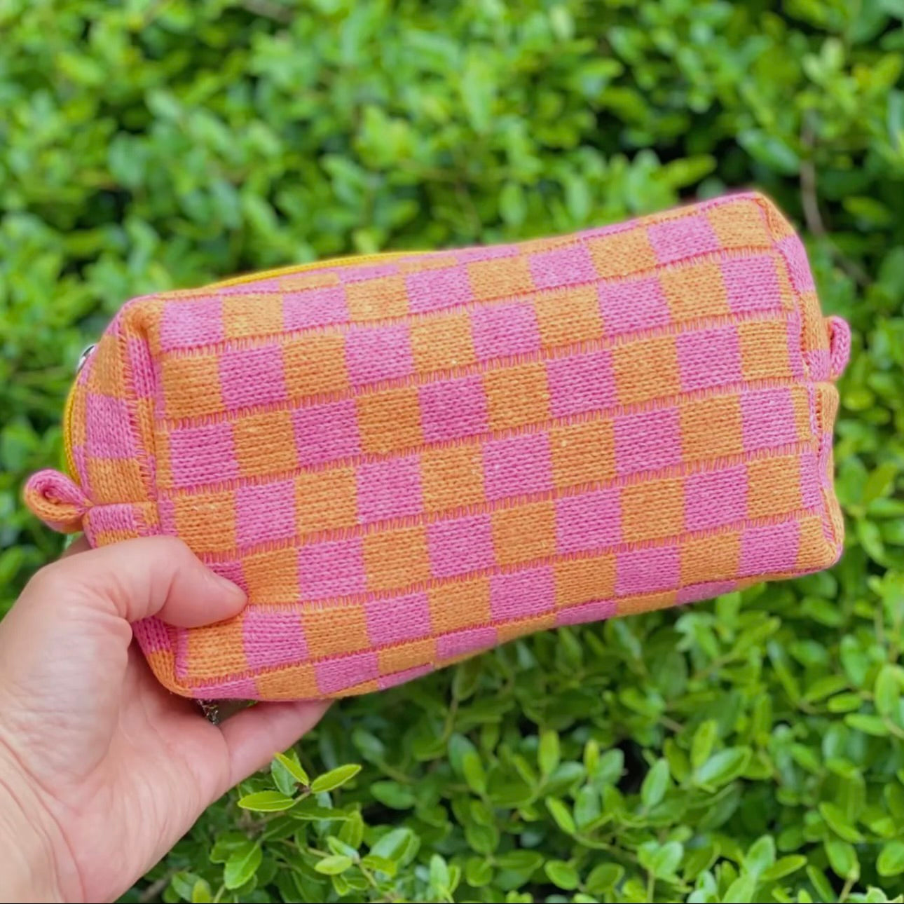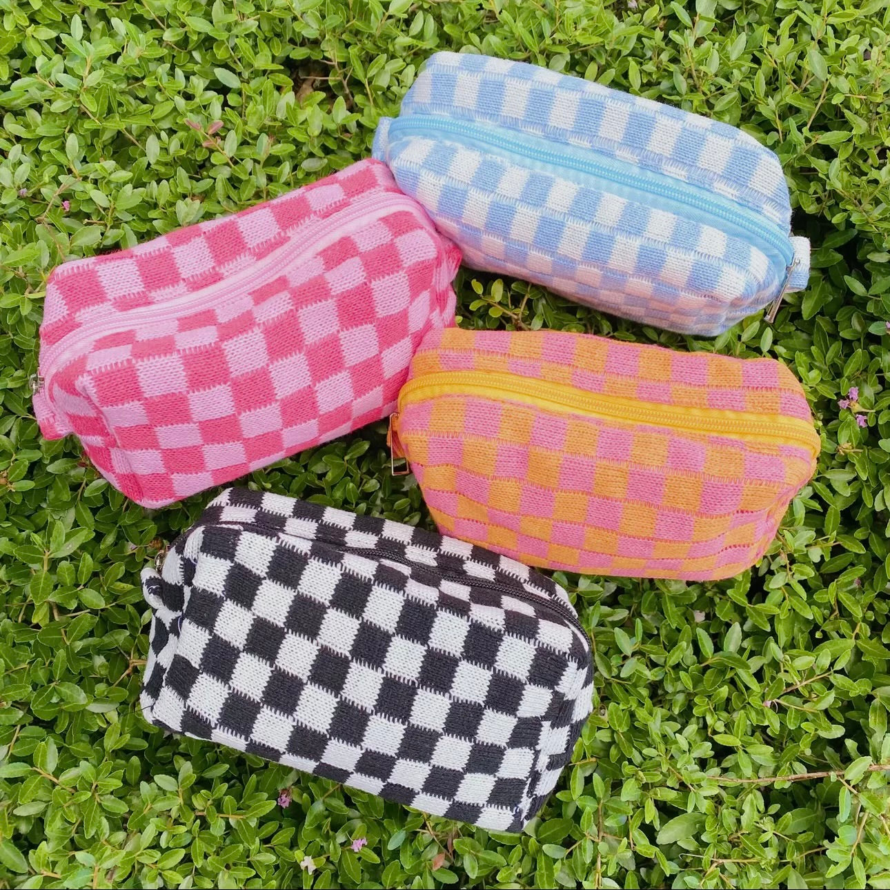 This handy cosmetic bag is in a checkered pattern made with knitted material. Light Vinyl lining inside. Absolutely adorable!