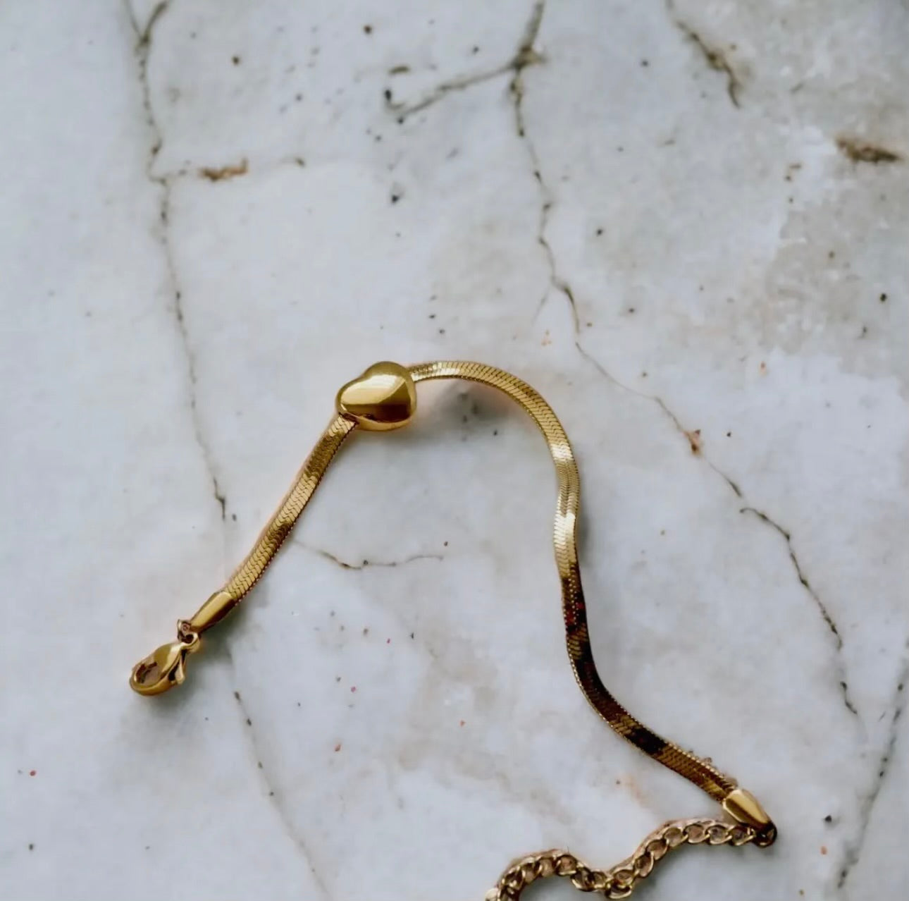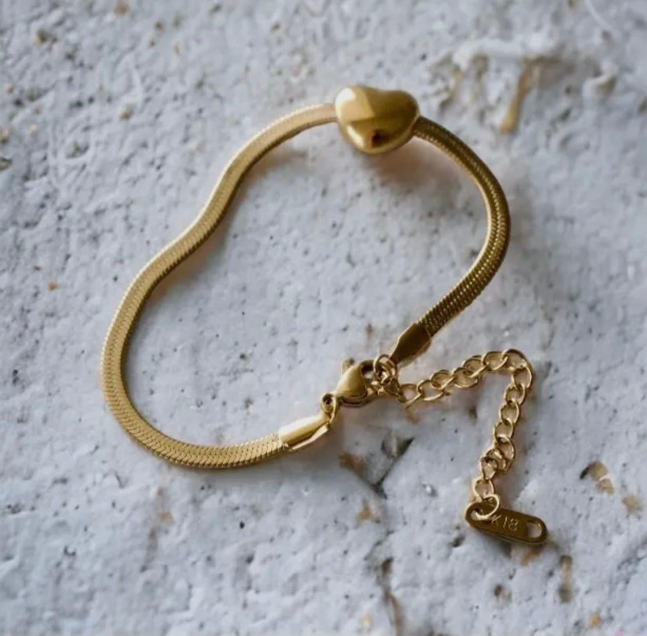 Featuring a bubble heart charm on a sleek, 18K gold plated snake chain.