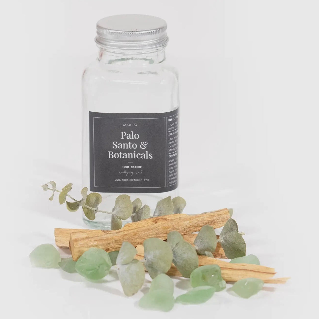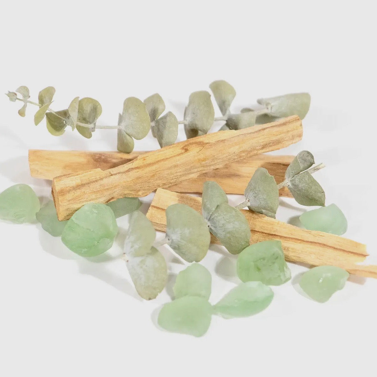 The Palo Santo & Baby Eucalyptus Smudging Jar Set contains palo santo harvested in Peru, and a delicate dried baby eucalyptus stem from California. This smudge kit is made to be both beautiful, simple and straight forward when you want to cleanse the energy of your spaces and including green quartz rocks in the base of the jar.